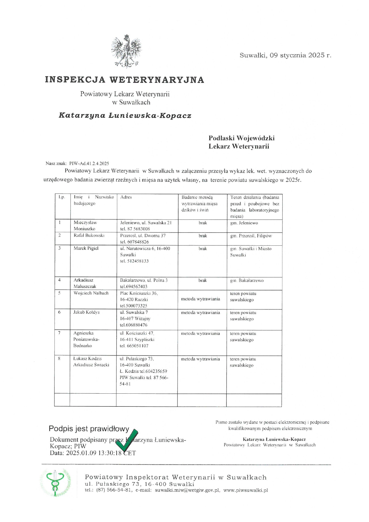 Wykaz lekarzy weterynarii wyznaczonych do urzędowego badania zwierząt rzeźnych i mięsa na użytek własny na terenie powiatu suwalskiego 01.2025 r.