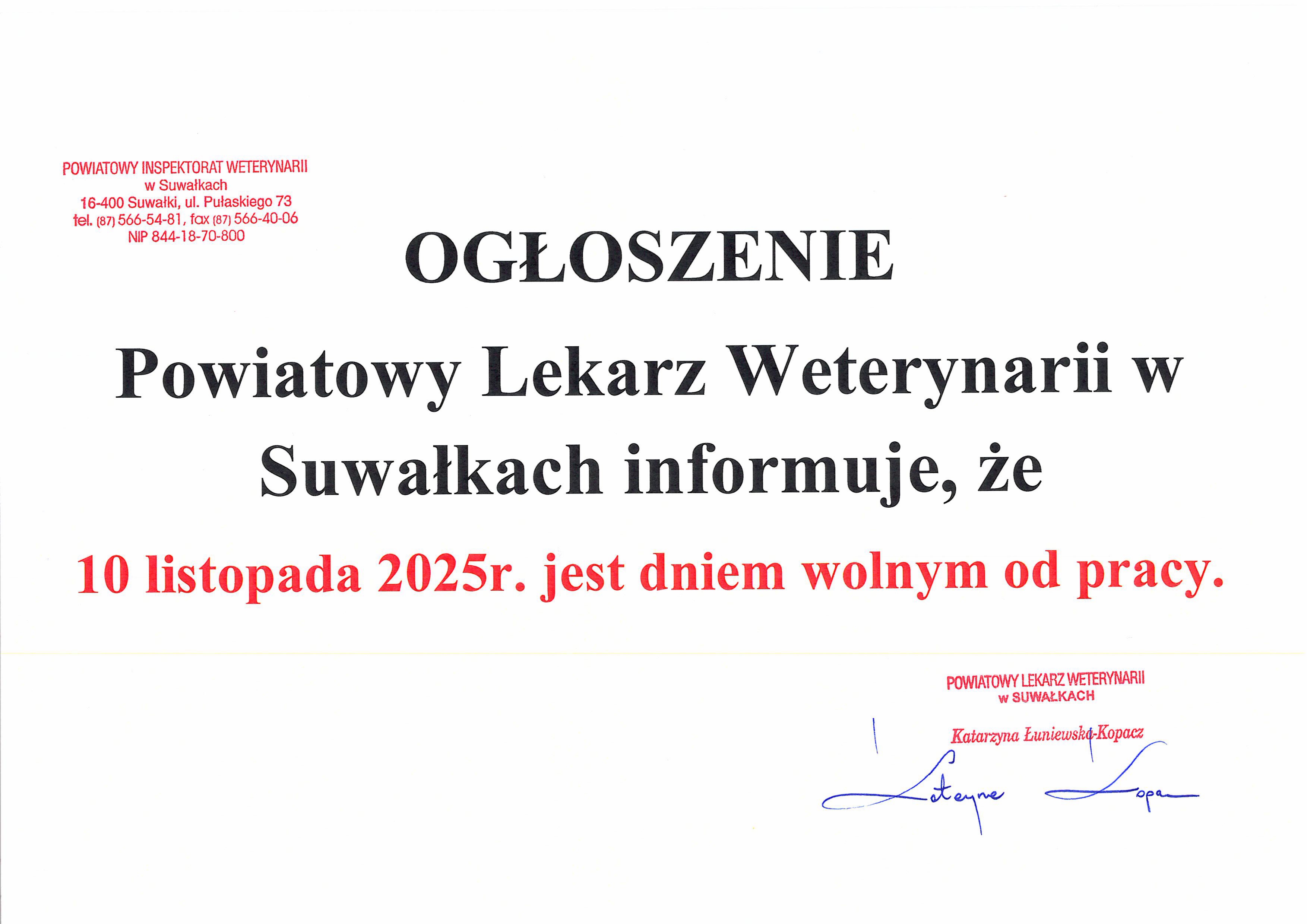 Ogłoszenie o dniach wolnych w listopadzie 2025 r.