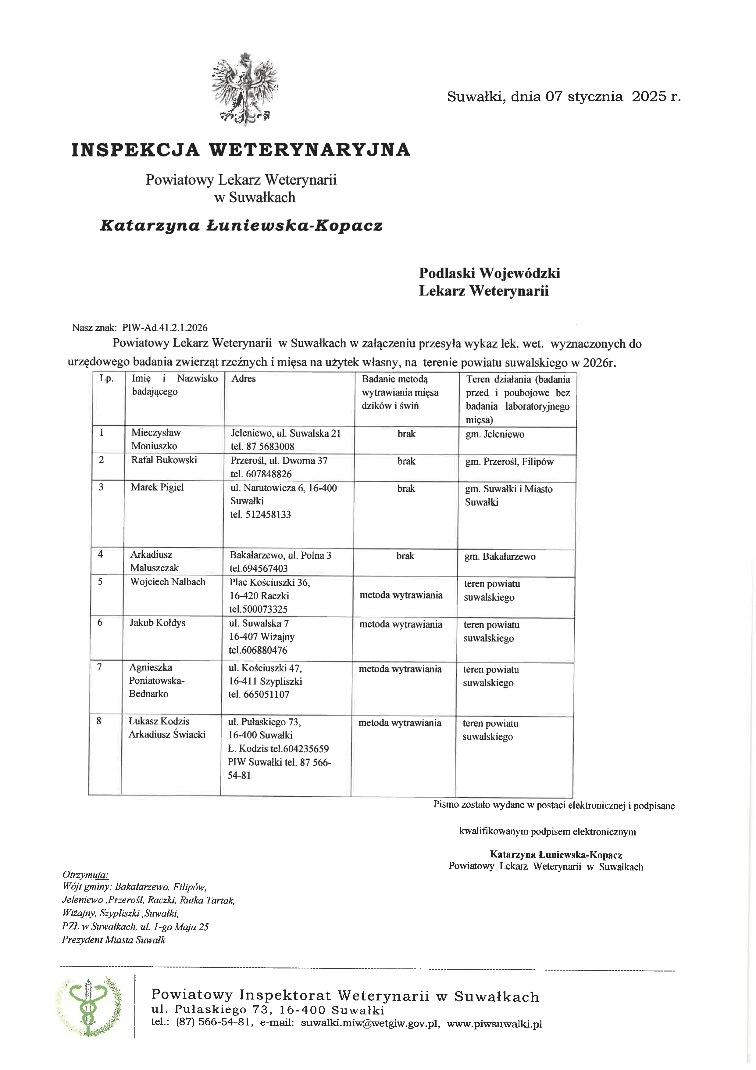 Wykaz lekarzy weterynarii wyznaczonych do urzędowego badania zwierząt rzeźnych i mięsa na użytek własny na terenie powiatu suwalskiego 01.2026 r.